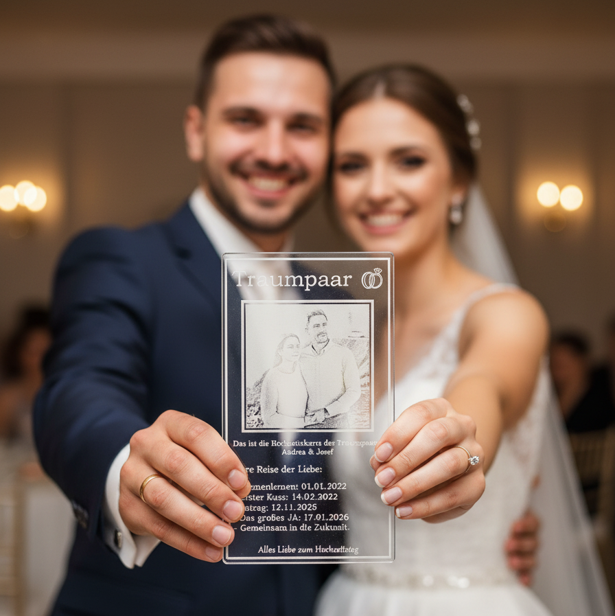 Die Hochzeit ist ein Meilenstein. Mit dieser Karte schenkst du dem Paar ein Unikat, das ihre gesamte Liebesgeschichte in einem eleganten, modernen Objekt vereint. Das hochtransparente Acryl lässt die Gravur und das Foto schweben und symbolisiert die zeitlose, klare Beständigkeit des Eheversprechens.