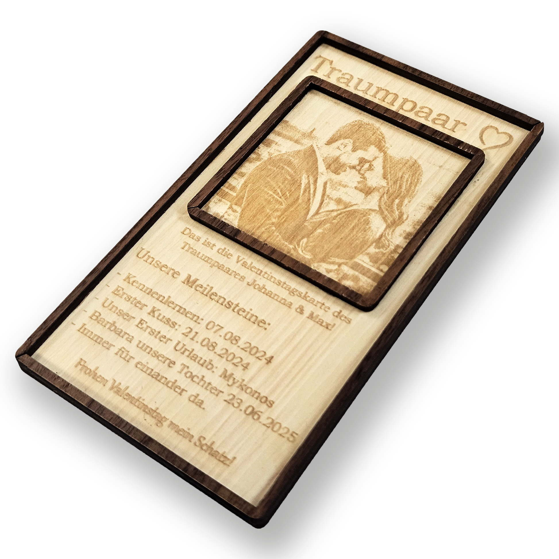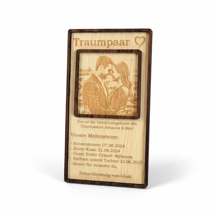 Jede Beziehung hat ihre unvergesslichen Momente. Mit dieser Karte schaffst du ein Geschenk, das eure gemeinsame Reise feiert. Die Gravur auf Naturholz speichert diese kostbaren Meilensteine in einer warmen, fühlbaren Textur. Zeige deinem Partner, dass du jeden Moment in Ehren hältst – von den Anfängen bis heute.