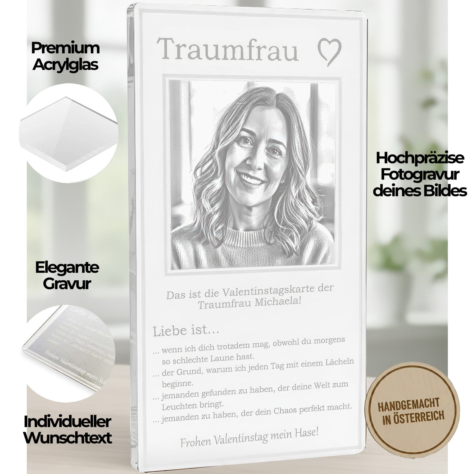 Der ultimative Liebesbeweis! Unsere personalisierte Karte ist ein elegantes Unikat aus hochtransparentem Acryl im großzügigen Format (142 x 80 mm). Graviere eure ganz persönliche Definition von Liebe (z.B. Liebe ist, wenn du den letzten Keks bekommst) und kröne das Unikat mit einem brillanten Foto von euch. Ein modernes, zeitloses Geschenk zum Valentinstag handgefertigt in Österreich.